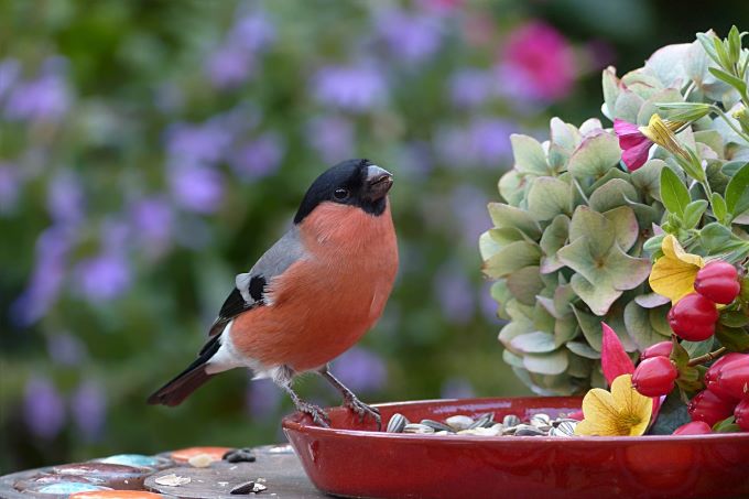 A seed-loving, smart male bullfinch will bring bright colour to your garden