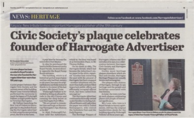 I contacted Harrogate Civic Society with our news. The late Malcolm Neesam, Harrogate historian, came to visit our building and gave it a great big “Yes!” He wrote the brown plaque honouring Pickersgill Palliser who is recognised as having a life of dedicated service to Harrogate. As a result, on 8 June 2022, the Mayor of Harrogate unveiled the plaque, and we had a reception party to share our news on our destination and our place in Harrogate culture and community. We are now included in the Montpellier plaque trail in Harrogate. And finally, we got a mention in the Harrogate Advertiser (founded by Pickersgill Palliser) to share the news!