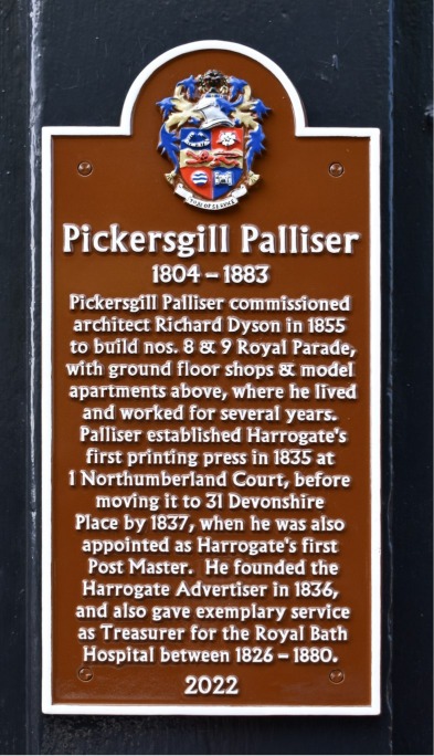 More research revealed that Pickersgill Palliser had come to Harrogate from Yarm as a young man with 2/6d in his pocket. He was the first person to list the Royal visitors to the Pump Room. He then founded the Harrogate Advertiser newspaper to record them. In 1840 he published Palliser’s History and Directory of Harrogate. In 1855 he purchased the land for 8 & 9 Royal Parade and had the buildings erected. In the 1871 Census he is recorded as living at 9 Royal Parade and running the shop below.